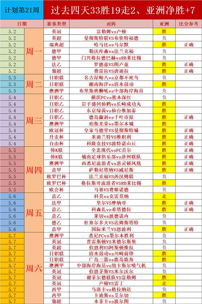 1、推演士计划第21周开启,昨天虽然稍有偏差,但不影响本周的胜率,在过去的4天推33胜19走2,亚洲净胜+7,依然保持着高效的净胜率,今天是本周最后一天的冲刺,第21周必定完美收官。