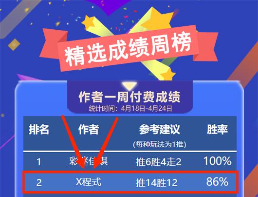 上上周精选成绩周榜排名第二,精选参考推14胜12(日期:4月18日-4月24日)