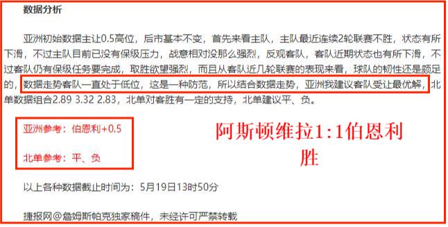 昨天英超顺利拿下,我们简单回顾一下,整场比赛阿斯顿维拉实力占优,各项数据都高于伯恩利,伯恩利在上半场将近结束时制造了点球,取得第一个进球,下半场几乎是处于防守的状态,但可惜最终还是没抵挡住阿斯顿维拉的进攻,最终被扳平比分,双方以1-1战平,而笔者选择的客队受让也顺利打出,今天乘胜追击,冲刺连胜。