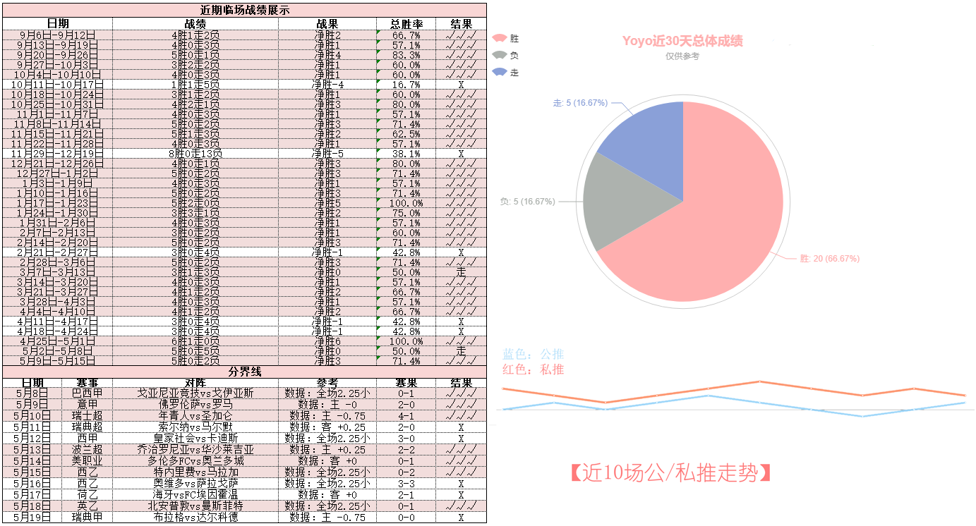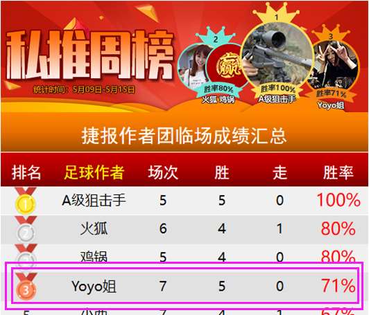 而上周7场临场战绩取得5胜2负的不俗表现,也成功排在周榜NO.3的位置呀!——今天重点参考场次已经确认,信心依旧,5月一起追随Yoyo继续前行鸭~