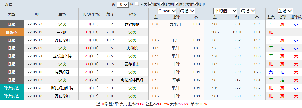 而汉坎作为挪超实力较差的球队,球队本赛季整体表现不理想,不过对于抢分能力还是比较强势,本赛季联赛取得1胜5平1负的成绩。汉坎上场联赛面对罗森博格,球队半场就落后对手,不过好在下半场能够扳平比分,面对强队能够继续保持抢分的势头,以1-1战平对手。