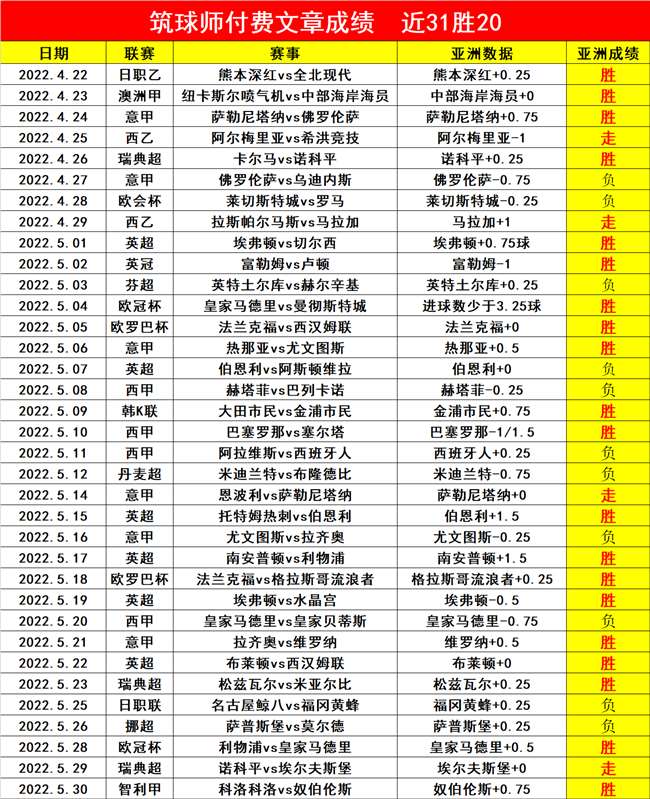过往精选成绩周榜排名第三,精选参考14胜11 日期:5月16日~5月22日