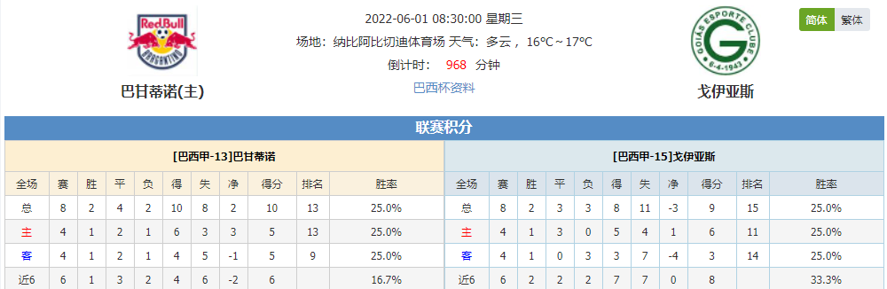 北京时间06月01日08:30,巴西杯第三圈次回合,巴甘蒂诺vs戈伊亚斯,主队近5轮各项赛事一胜难求,球队状态较为低迷;而客队近5轮联赛取得2胜2平1负状态较为平稳;两队都是巴西甲联赛第13、15名,联赛方面排名较为接近,今天比赛两队相遇哪一会表现会更好呢?