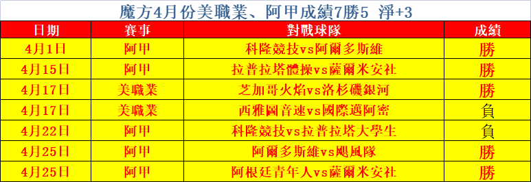 魔方昨日澳賽失利,中超3勝2。阿甲、美職業4月份7勝5,淨+3。今日奉上美賽專場與大家分享。魔方將繼續努力,追求精益求精。