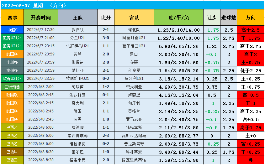今天的比赛较多,笔者挑选了部分夜场比赛出来作为本期的参考,希望能够打出对应的高概率方向!