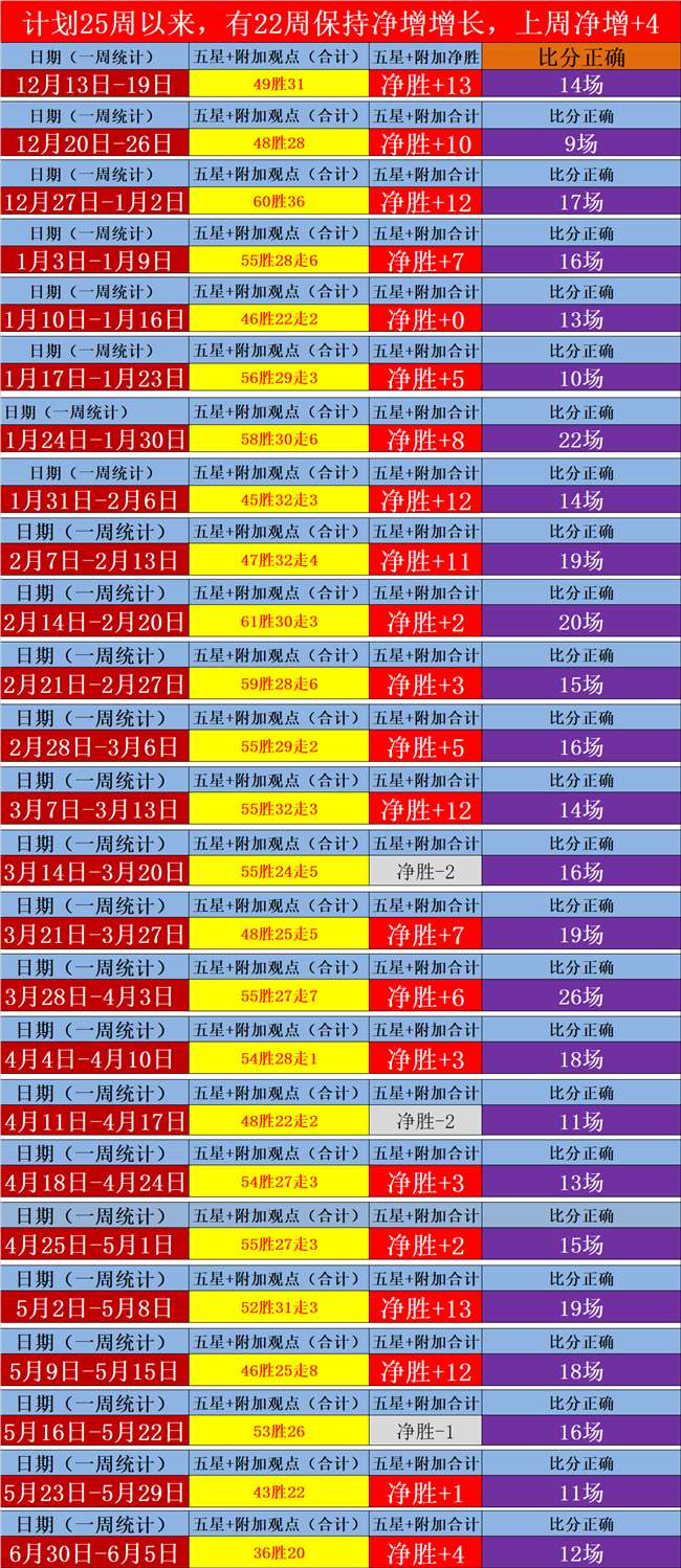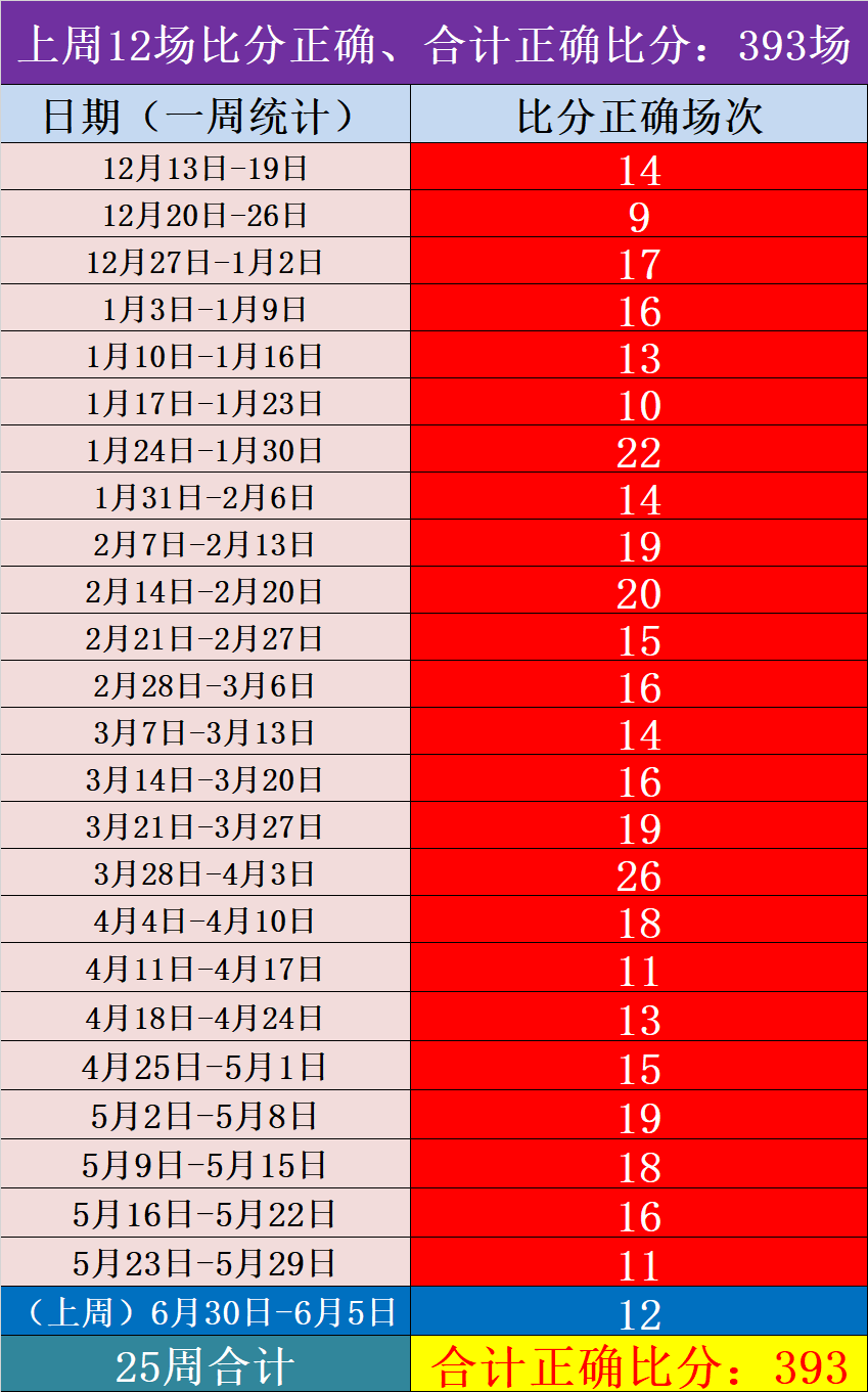 3、预测正确比分统计,过去25周(12月13日-6月5日)推演士共预测正确比分达到了393场,这数字惊人,说明一个道理,就是推演模拟方向精准度非常高,而且是长期稳定的,推演士几乎每天的赛事都会预测正确比分,这就是大家稳定的基石,请大家持续关注推演士。