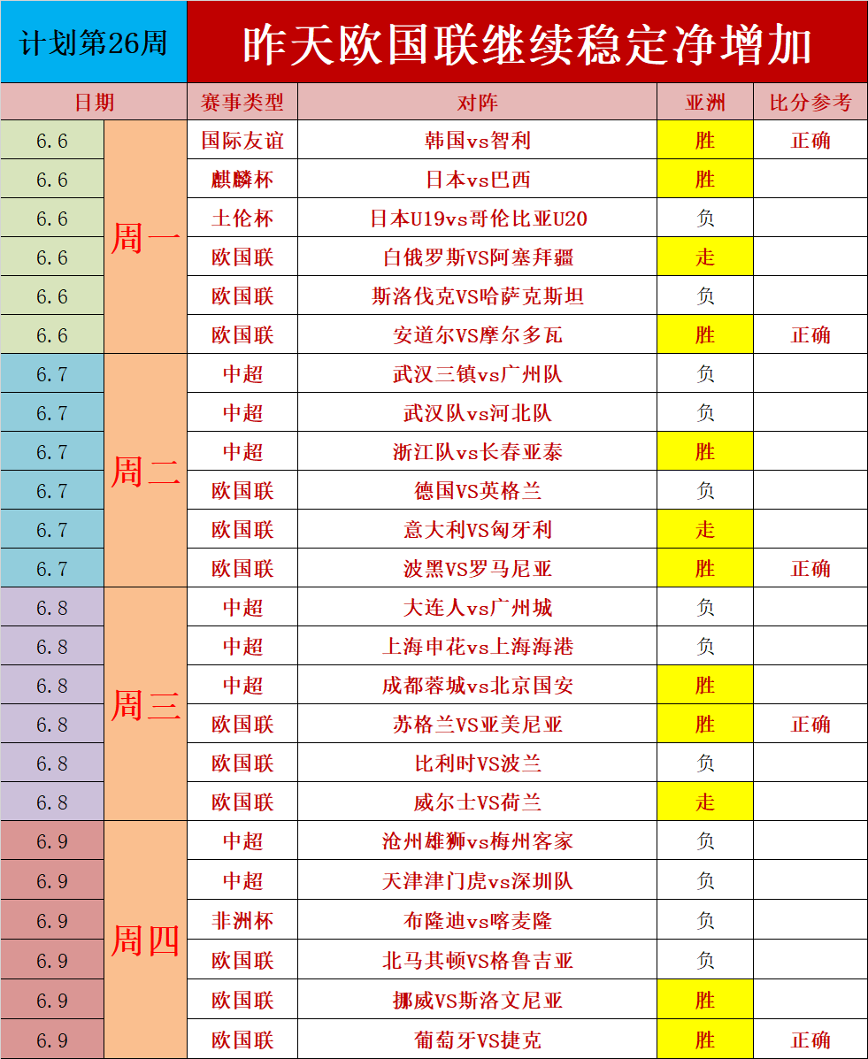1、推演士计划第26周(亚洲走不纳入统计,只统计胜负成绩):昨天整体的战绩少有偏差,但不影响整体,这周一至周四保持稳定,不过值得一提的是,昨天的欧国联继续保持稳定的净增长,拿下3胜2,目前欧国联开赛至今19胜13,今天早场麒麟杯和友谊赛,推演本周的麒麟杯和友谊已经取得2连胜,这并不是偶然,友谊赛有很多误区,别掉坑。