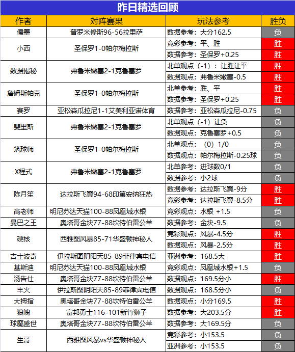 付费精选专区:小西、数据揭秘、詹姆斯帕克、陈月笙、硬核、吉士波奇、汤告仕、大拇指、狼魄昨日精选赛事稳稳打出,其中詹姆斯帕克近5场全胜,陈月笙近5胜4;硬核近6场胜率100%;今天赛事继续展开精彩角逐,捷报作者团将一如既往地分享他们的思路分析和独家建议,欢迎大家多多关注!