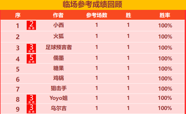 关注捷报前瞻栏目,作者胜场天天有,赶紧来看看今天有哪些作者榜上提名: