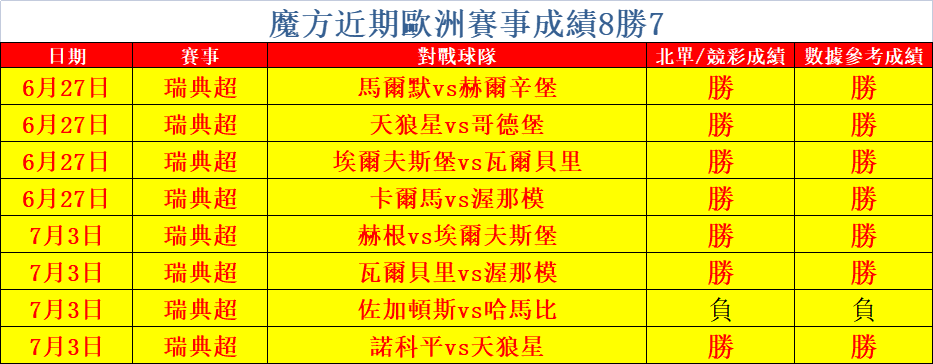 近期歐洲賽事不多,總結出近期歐洲賽事成績,瑞典超賽事8勝7,正向+6,成績不俗。魔方將繼續努力,追求精益求精。