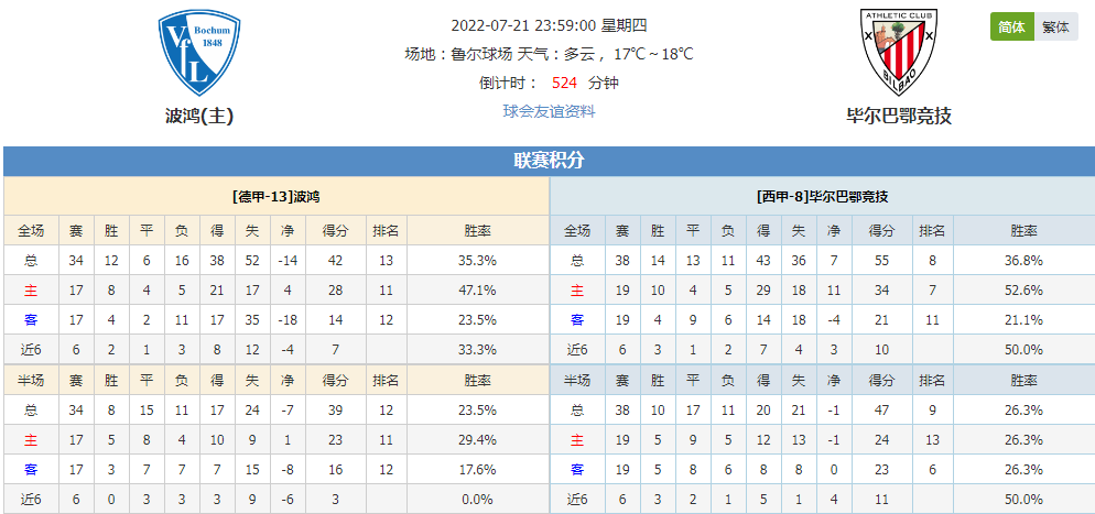 波鸿上赛季德甲成12胜6平16负,积分42,排名第13;毕尔巴鄂竞技上赛季西甲成绩14胜13平11负,积分55,排名第9