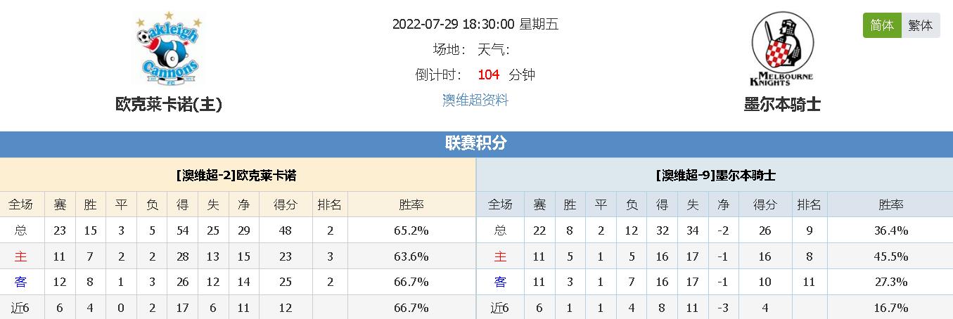 北京时间7月29日18:30,澳维超2022赛季第24轮比赛,赛季创造了一轮强势上分期的欧克莱卡诺近期脚步有所放缓,本次回归主场迎战墨尔本骑士能否成功维护主场尊严?让我们拭目以待!