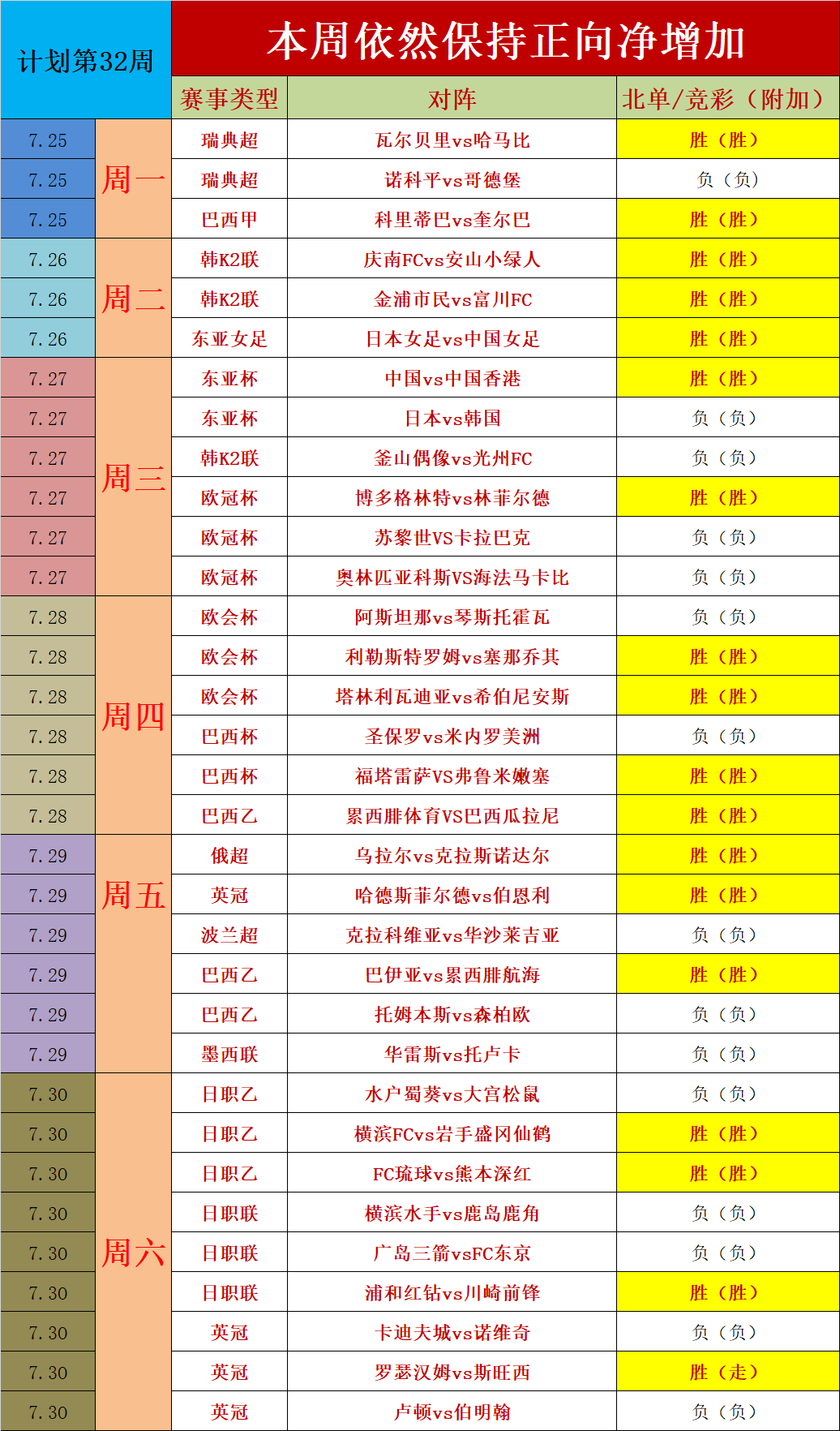 1、推演士计划第32周:昨天整体稍有偏差,但不大,这是正常的波动,更能让今天的比赛更有头绪,随着欧洲的主流联赛开启,开始进入了推演的疯狂取胜的时候了,以往的数据可以说明,主流联赛是推演的重点和强项,因为主流联赛推演无论是资讯和球队的基本信息,和以往的数据等,推演都有全面的数据库,今天只有2场日职,要小心谨慎。