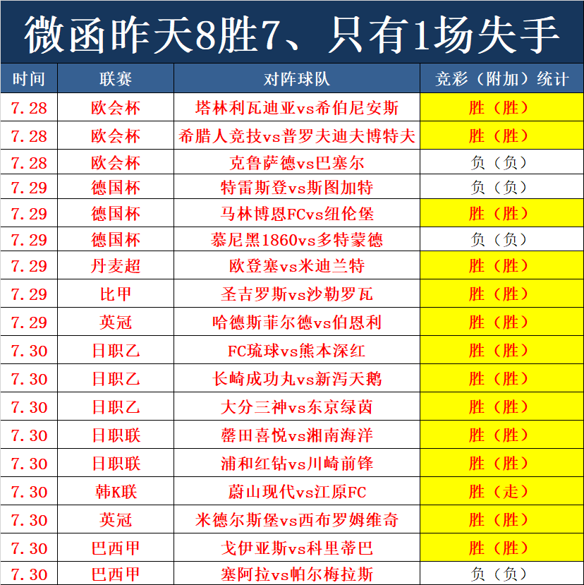 精彩分享:昨天微函状态巅峰,顺利拿下了8胜7惊人成绩,其中日职大获全胜,获得5连胜的佳绩,昨天仅仅只有1场失手,昨天的建议依然是多元化,进球数和胜负方向都有,微函在近期处在巅峰的状态,昨天的联赛类型也是多种,这一点能够说明微函并不是擅长个别联赛,而是全面性的,因为微函只从联赛的数据去寻找突破口,只不过主流联赛的精准度会高一点,近三天17胜13,今天周日,我们继续狂胜的状态。