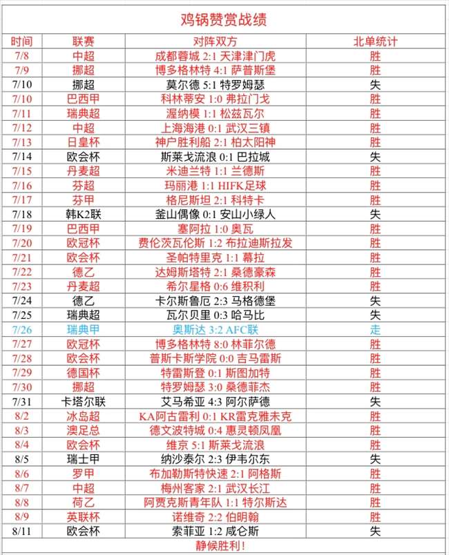 周四私推结果不佳,选场出现了错误,与胜利擦肩而过!赞赏数据近33胜25,表现非常稳健!总进球数还需继续总结分析!付费文章近11胜7!在此有个小说明,鸡锅无论当天有没有发送公推文章,赞赏私推都是正常发送的,如果鸡锅当天只发了付费文章,老铁们可以去鸡锅以往任何一篇公推文章下面赞赏即可获得当日赞赏私推!赞赏数据、赞赏总进球数和付费文章,这三条战线,鸡锅是齐头并进的,一起起飞!鸡锅私推会持续保持精挑细选原则,在精不在多,必须全胜起飞!