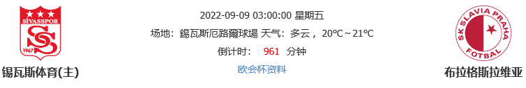 北京时间09月09日03点00分,22-23欧会杯小组赛首轮的一场比赛,布拉格斯拉维亚将前往锡瓦斯厄路尔球场与锡瓦斯体育展开较量。锡瓦斯体育当前在各项赛事中已经连续8场不胜,此番欧会杯对阵锡瓦斯体育,主队想要反弹恐也显得有心无力。