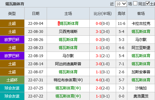2、锡瓦斯体育的主场也并没有太多优势可言,在上个主场与卡拉古拉克互交白卷后,他们已经连续4个主场未能取胜。