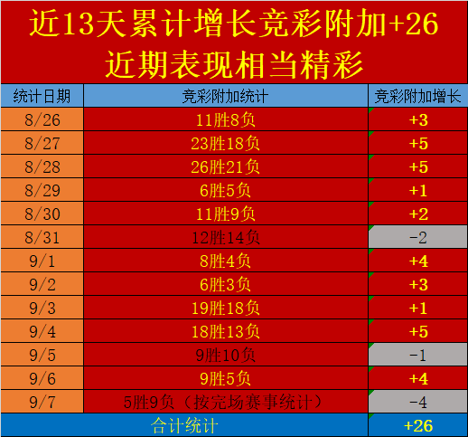3.近期整体成绩保持相当出色发挥,近13天累计竞彩附加+26(昨天还有两场未完场,按完场成绩统计),高速的成绩增长信心高度维持;