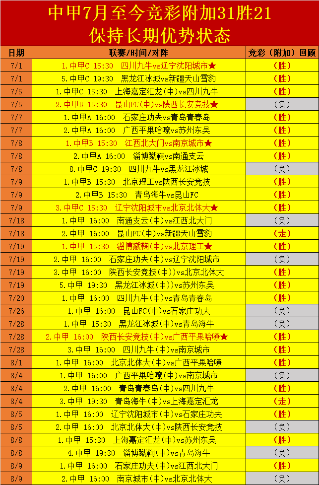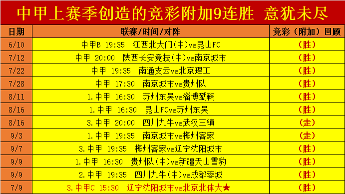 2.中甲上赛季曾经创下辉煌的竞彩附加9连胜,辉煌成就令人意犹未尽;