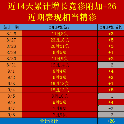 3.近期整体成绩保持相当出色发挥,近14天累计竞彩附加+26,高速的成绩增长信心高度维持;