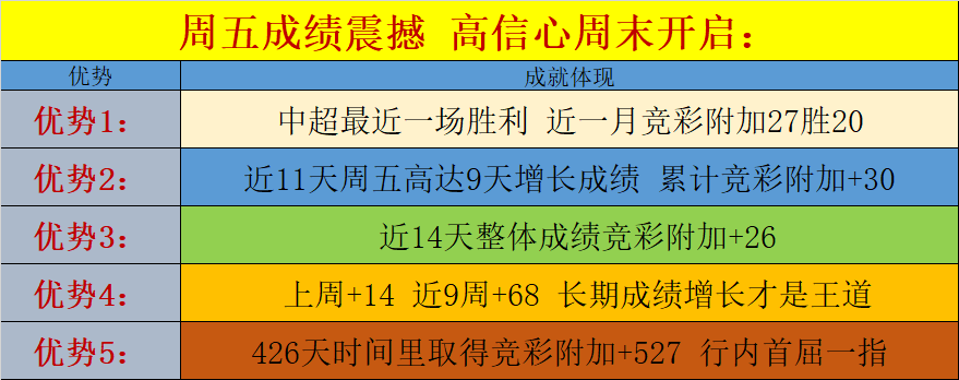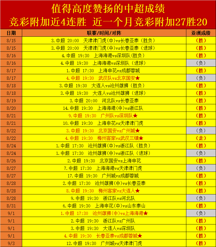 1.近一次中超轻松拿下胜利,中超近一月竞彩附加27胜20,中超保持着相当出色的发挥;