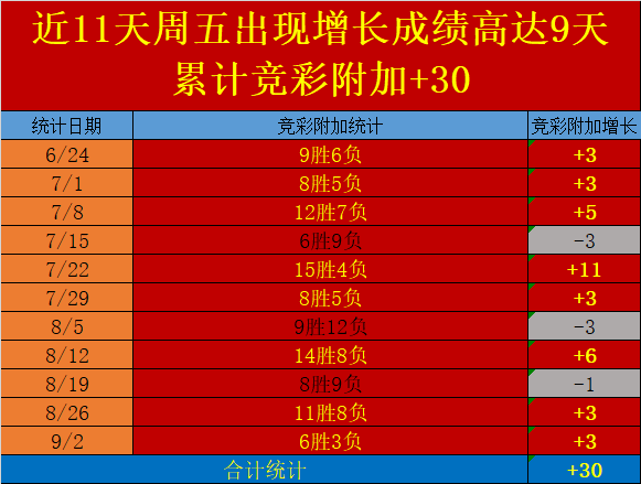 2.今天周五,周末发挥更出色,近11天周五高达9天出现增长成绩,累计竞彩附加+30,对周五赛事的分析能力确实更高一筹,周五更值得支持;