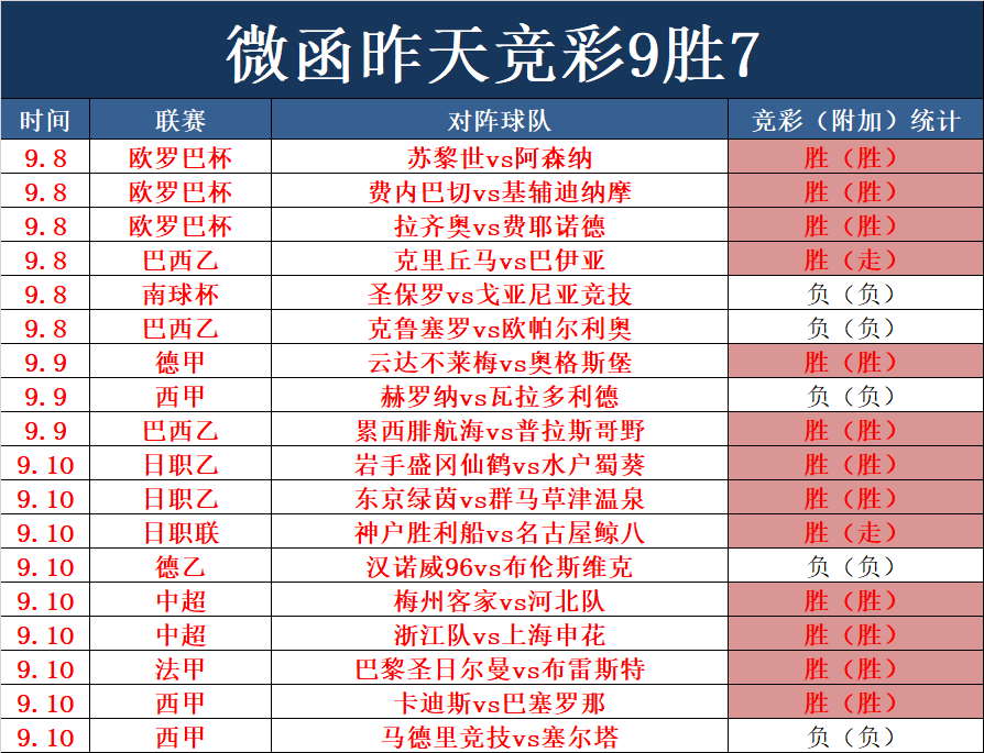 精彩分享:昨天再次打出漂亮的战绩,昨天竞彩9胜7,只有2场失手,日职和中超竞彩全胜,取得6连胜,而欧洲五大联赛取的3胜2,九月份已经过去3分之一,微函依旧保持稳步前进,保持着正向的净增长。