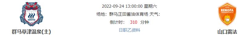 北京时间2022年09月24日13:00,日职乙的第38轮比赛,由群马草津温泉坐镇主场迎战山口雷法,本赛季首循环,群马草津温泉客场1-2不敌山口雷法,本轮回到主场,群马草津温泉能否借主场之利扳回一局?