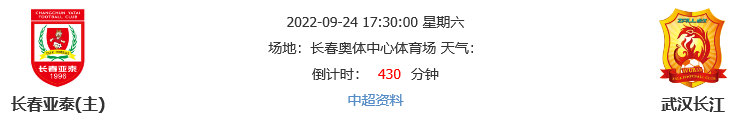 北京时间09月24日17点30分,2022中超联赛第17轮的一场比赛,武汉长江将前往长春奥体中心体育场与长春亚泰展开较量。武汉长江近期遭遇联赛两连败,本轮作客联赛排名在自己之上的长春亚泰,客队的发挥不宜高估。