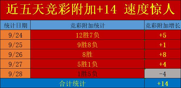 1.近五天竞彩附加+14,近期胜利增速明显加快;