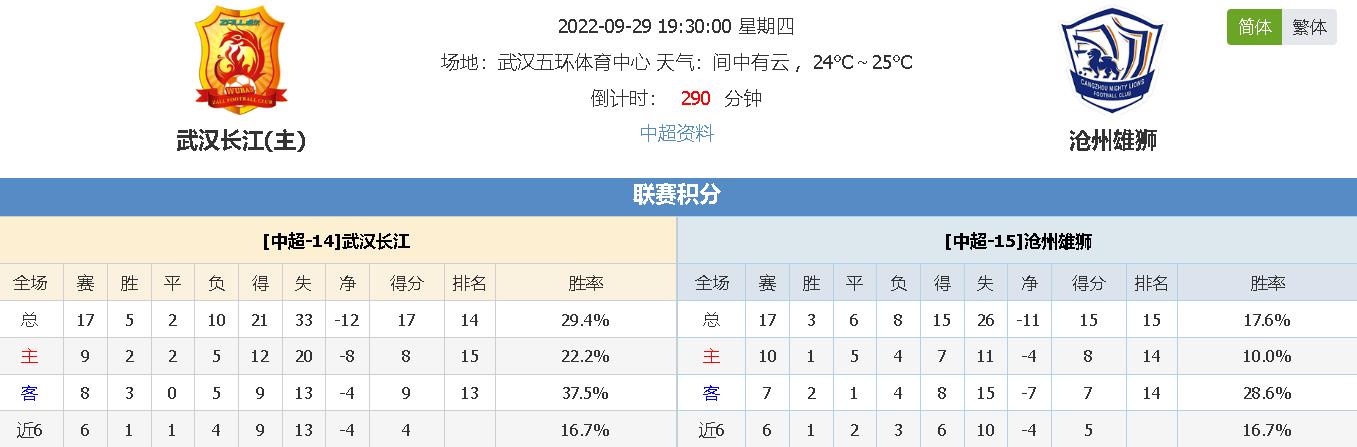北京时间9月29日19时30分,中超2022赛季第18轮比赛,武汉长江vs沧州雄狮,两支积分榜排名刚好紧靠降级区的球队在联赛中期相遇,本场比赛的胜负会否让双方剩余的赛程往不同的方向发展呢?让我们拭目以待!