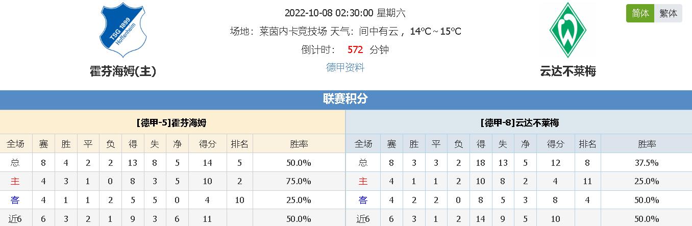 北京时间10月8日02时30分,德甲2022-2023赛季第九轮比赛,霍芬海姆vs云达不莱梅,本赛季霍芬海姆的主场和云达不莱梅的客场都表现出色未尝一败,本轮比赛会否有其中一队被打破不败的金身呢?让我们拭目以待!