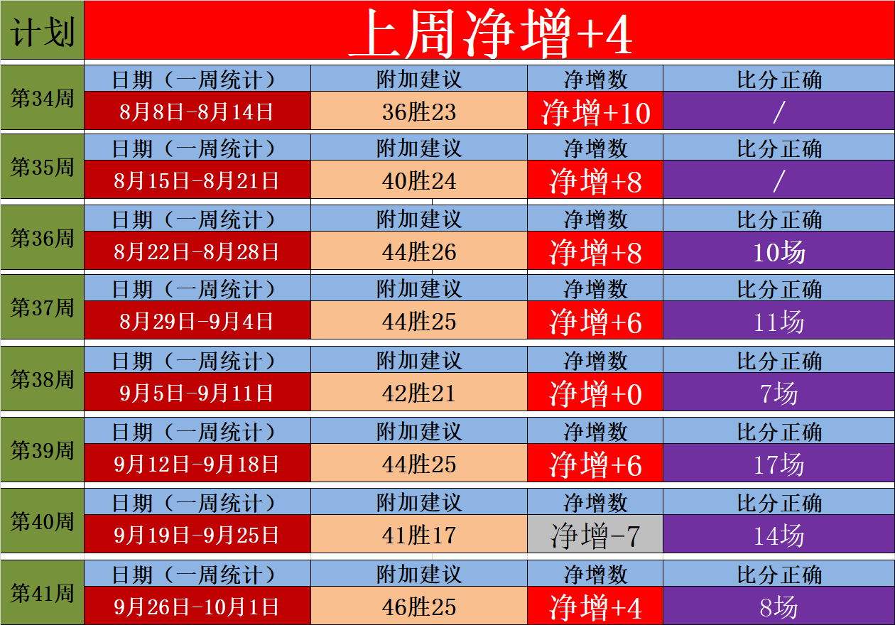 2、近8周有7周净增长,8周净增+42场,上周预测8场比分正确,持续的保持了高效的稳定。