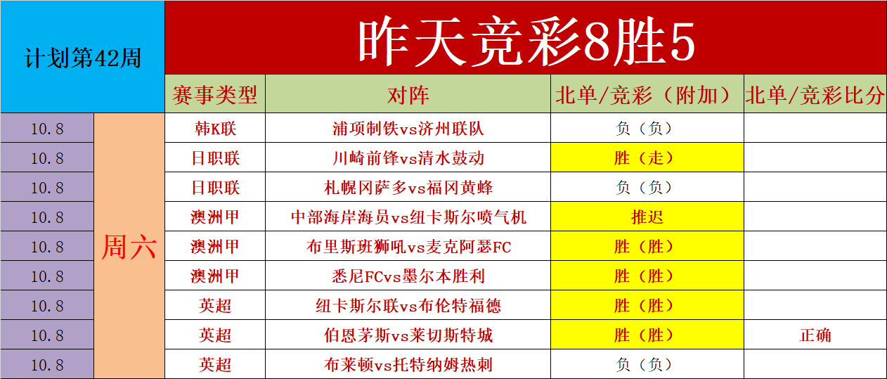 1、推演士计划第42周(走不纳入统计),昨天没有令大家失望竞彩8胜5,澳甲2场全胜,五大联赛依然出众,英超3胜2,今天早场还有正赛,我们继续,中超+日职乙。