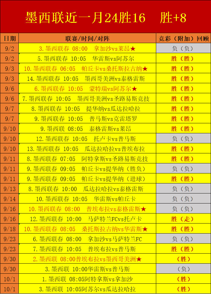 3.墨西联近一个月24胜16,胜场达到+8进度,其中9月3日-9月7日三天拿下6连胜的100%增长!