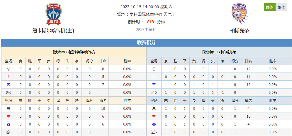 北京时间10月15日14:00,澳洲甲第2轮,纽卡斯尔喷气机对阵珀斯光荣。纽卡斯尔喷气机久疏战阵,不过上赛季与珀斯光荣交手占据优势,此番重新相遇能否捍卫主场?珀斯光荣近况回暖不佳,首战就显露出颓势,球队此役能否抢走分数?