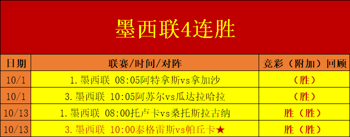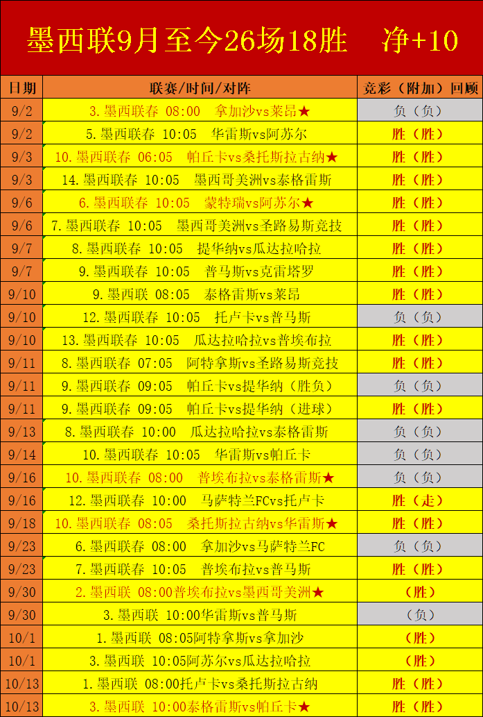 1.墨西联9月至今26场比赛拿下了18场胜利,净+10,并且在进入10月的比赛之后拿下了4连胜的优质增长表现;