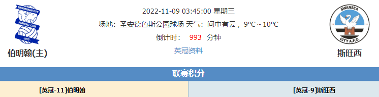 1、2022-23赛季英格兰足球冠军联赛第9轮一场补赛打响,伯明翰主场迎战斯旺西。英冠联赛共24支球队,以主客场双循环作赛,联赛前2名直接升入英超联赛,3-6名参加升级附加赛,后3名直接降入英甲联赛。伯明翰是英冠下游份子,球队本赛季迄今表现有所提升,上轮联赛客场2-1战胜斯托克城,近4轮联赛2胜2平保持不败,目前7胜6平6负积27分排名英冠第11位,球队进攻一般但防守十分出色,场均失0.84球为联赛第2少。