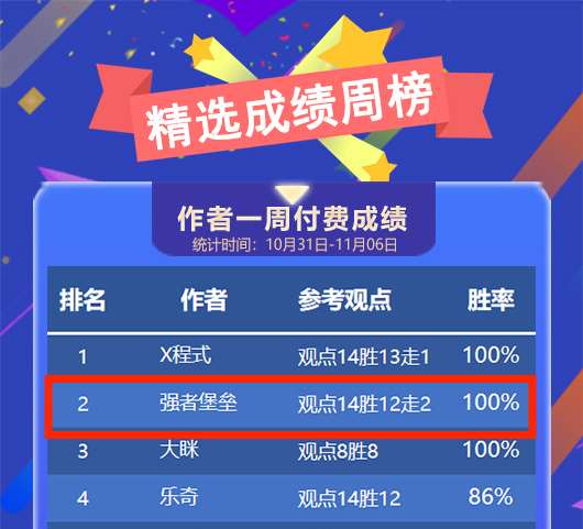 上周成绩周榜排名第二,观点14胜12走2,胜率100%
