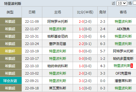 1、特里波利斯本赛季在联赛中的发挥稳有余,可胜率不高,12轮联赛战罢,他们只是以1胜7平4负积10分的成绩排名积分榜第9位,处在平庸的局面中。