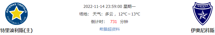 北京时间11月14日23点59分,22-23希腊超联赛13轮的一场比赛,伊奥尼科斯将前往客场与特里波利斯展开较量。特里波利斯本季在联赛中仅取得过1场胜利,本轮面对状态同样不佳的伊奥尼科斯,他们能否取得反弹?