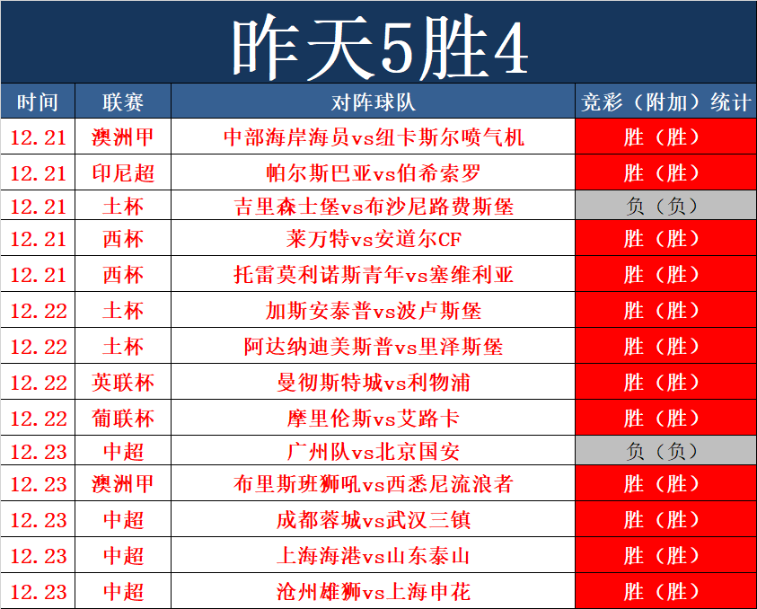 精彩分享:昨天又创下5胜4的战绩,近期处在巅峰状态,昨天的中超4胜3,澳洲甲大获全胜,澳洲甲保持连胜的势头,今天继续巅峰状态。