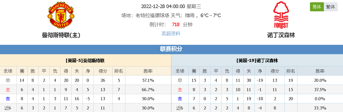 北京时间12月28日04:00,英超联赛2022-2023赛季第17轮比赛,曼彻斯特联坐镇主场迎战升班马诺丁汉森林,双方时隔23年历史性再度碰头,世界杯过后各大主力回归的曼联能否延续休赛前的状态在老特拉福德球场仔迎一场胜利?深陷位置的诺丁汉森林又能否虎口拔牙抢下足以令球队摆脱泥潭的保命三分?让我们一起关注!