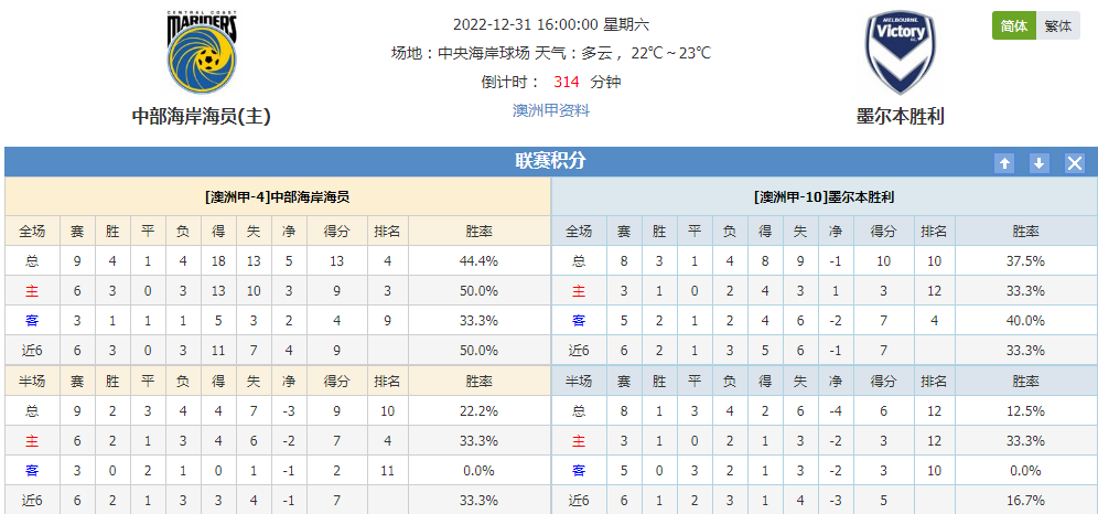 中部海岸海员本赛季澳洲甲成绩4胜1平4负,积分13,排名第4;墨尔本胜利本赛季澳洲甲成绩3胜1平4负,积分10,排名第9