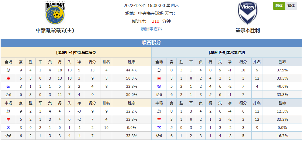 北京时间12月31日16:00,2022-2023 澳洲甲组联赛,由中部海岸海员vs墨尔本胜利,中部海岸海员近期主场都能取得胜利,今天比赛同样是主场作战情况下能否再添胜绩?