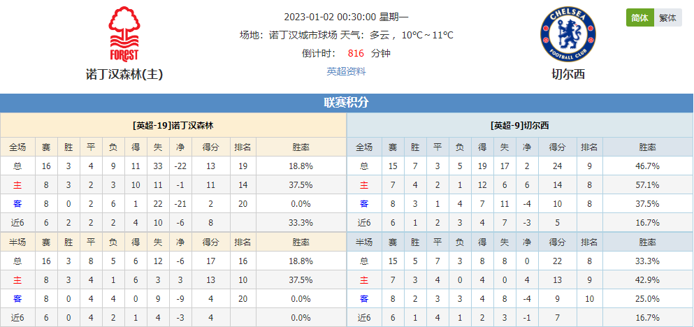 看点:诺丁汉森林上一场比赛客场0-3不敌曼彻斯特联,此役主场作战状态能否提升?切尔西上一场主场2-0战胜伯恩茅斯,此役作客能否取连胜?