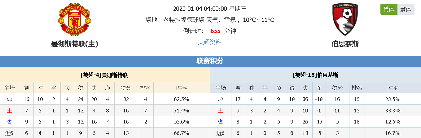 北京时间01月04日04时00分,英超联赛2022-2023赛季第19轮比赛,曼彻斯特联vs伯恩茅斯,主队在上轮取胜终于回归前四的队列,目前他们战意旺盛势必希望保住前四的位置,本场是不容有失的比赛,客队在本季表现平平在休赛期归来后更是一胜难求,本场能否反客为主抢得积分呢?我们拭目以待!