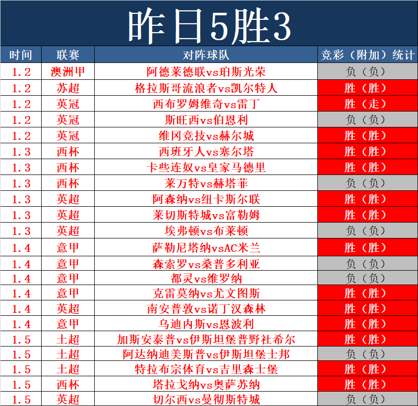 精彩分享:昨日表现不错,昨日5胜3,土超3胜2,杯赛冷门打出,奥萨苏纳常规时间内拿不下对手,观点准确,凌晨赛事乘胜追击。