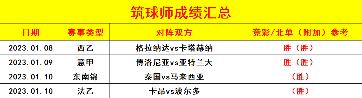 昨天为大家精选了两场比赛,早场送出一场东南锦的比赛:泰国vs马来西亚,参考主队方向,结果泰国以一场3-0的比分完美拿下;夜场乘胜追击,为大家送上一场法乙的比赛:卡昂vs波尔多,送出客队方向,结果以2-2的比分结束比赛;两场比赛竞彩附加都完美拿下,目前成绩已取得4连胜;承接当前的好运气,今天继续为大家分享两场比赛,希望大家能多多支持筑球师。