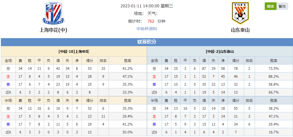 北京时间01月11日14:00,中协杯比赛,上海申花vs山东泰山;两队在中协杯表现都非常不错,往绩方面双方都是平分秋色,今天中协杯再次相遇,哪一队表现会更加精彩?